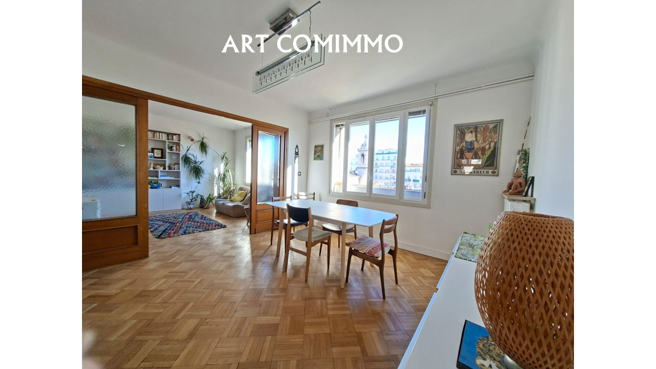 Situé au 5ème étage avec ascenseur d'un immeuble bien entretenu des années 1950, ce séduisant T3/4 traversant de 89 m² habitables (83 m² Carrez) a été rénové avec goût. Il offre une belle luminosité tout au long de la journée grâce à sa double exposition Est/Ouest.